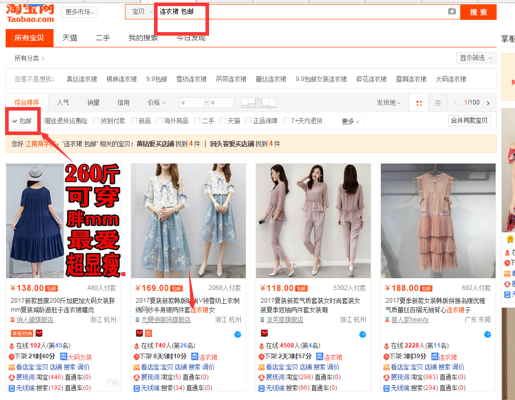 第二,大家发现没有,在我们搜索后宝贝标题,只描红了‘连衣裙’这个词根 ,而‘包邮’并没有被描红,这说明了什么?这说明‘包邮’是一个系统默认关键词。在买家搜索‘包邮’的时候,搜索引擎会直接默认展示包邮产品,在标题中有无‘包邮’,都是无所谓的,搜索引擎不会去甄别他。